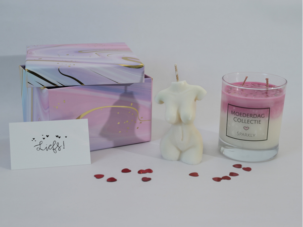 Onze moeders zijn de liefste en dat willen we laten zien! Dit cadeautje bestaat uit een luxe geurkaars, een kaartje, keuze uit hartjes melts/bubble kaars/body kaars en nog een kleine verrassing.